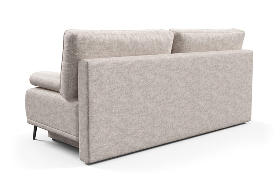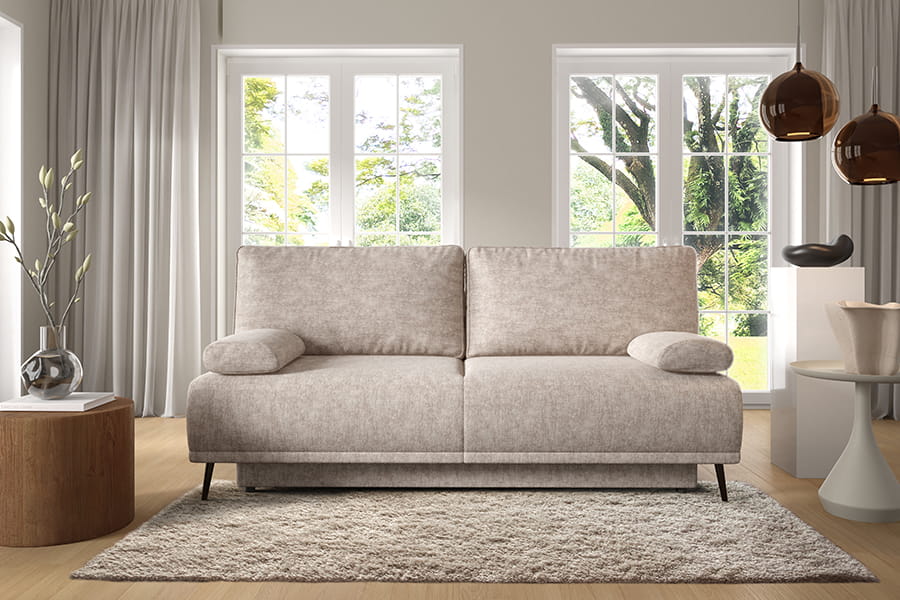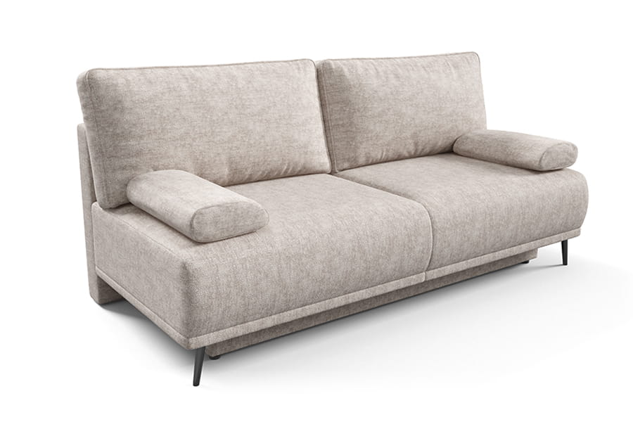 Kanapa Bella Bis z funkcją spania typu automat DL, rozłożenie kanapy jest szybkie i wygodne, idealne na spontaniczne nocowanie gości lub codzienne użytkowanie. Wbudowany pojemnik na pościel pozwala na przechowywanie kołder i poduszek, dzięki czemu wszystko masz pod ręką, a w Twoim salonie zawsze panuje porządek. Zdejmowane poduchy oparciowe umożliwiają dostosowanie wygody do Twoich potrzeb, a dołączone dekoracyjne poduszki dodają uroku i przytulności wnętrzu. Tapicerowany tył kanapy pozwala na swobodne ustawienie jej w dowolnym miejscu w pokoju – nie musisz ograniczać się do ustawienia przy ścianie. W zestawie znajdują się trzy duże poduszki i dwie małe poduszki.