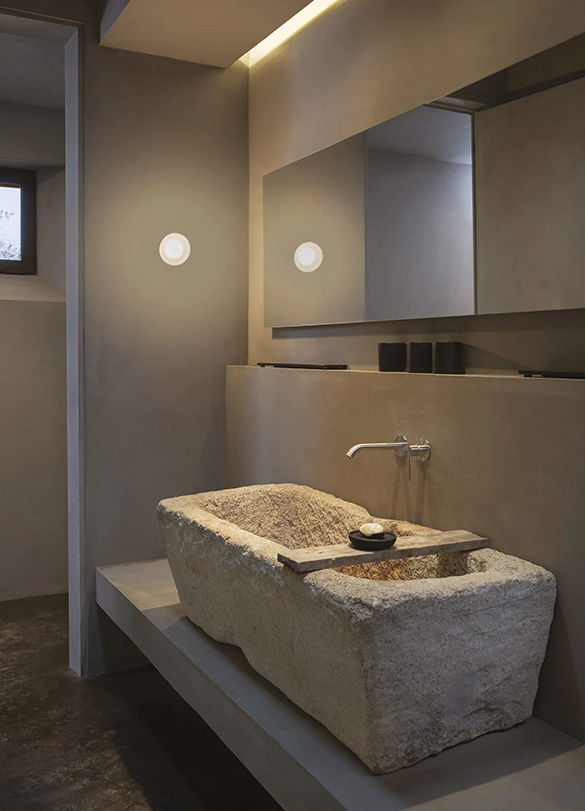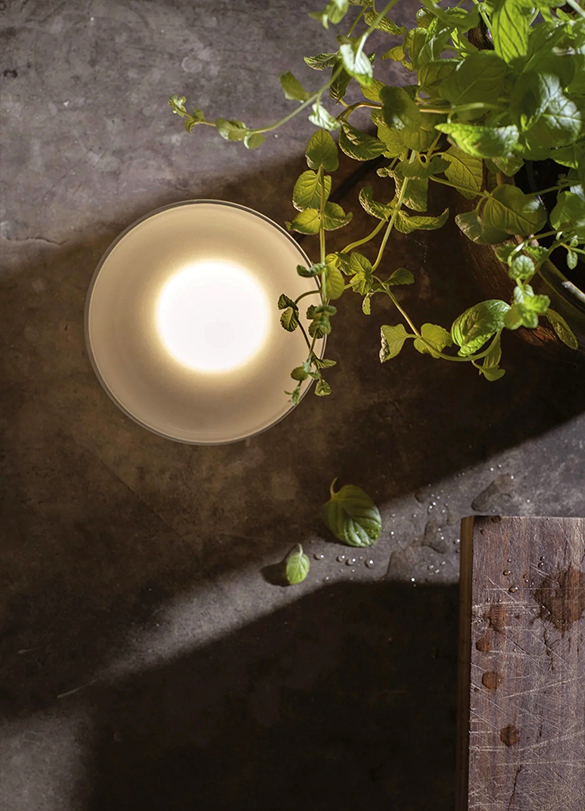 Okrągły, dmuchany reflektor z grubego szkła, w wykończeniu przezroczystym lub satynowym. Agua może być używana jako lampa stołowa lub ścienna, tworząc efekt halo na ścianie lub innej odbijającej światło powierzchni. Podstawa wykonana jest z czarnego anodowanego aluminium z wewnętrznym dyfuzorem chroniącym źródło światła LED. Można ją ustawić w geometrycznych lub losowych wzorach, jako punktowe oświetlenie na stoliku nocnym lub w ukrytym kącie domu lub ogrodu.
