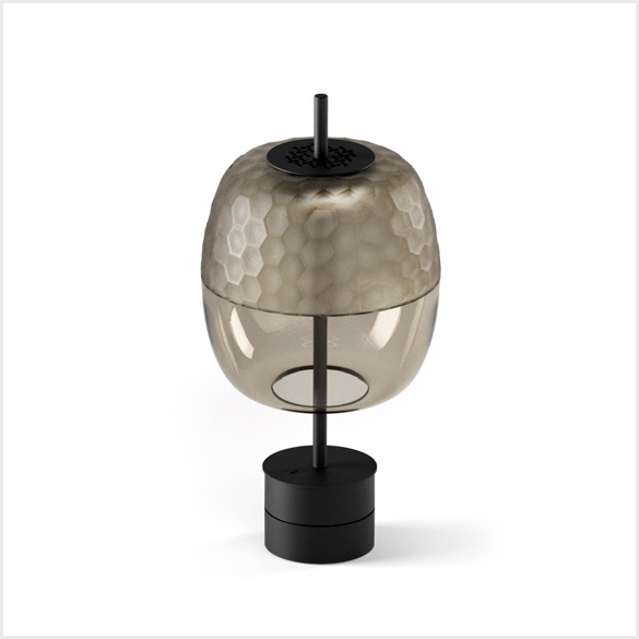 Adamas celebruje sztukę szkła, rzemiosło, dbałość i dbałość o jakość. Rezultatem jest ikoniczny i otulający kształt, który charakteryzuje otoczenie światłem, poprzez miękkie odcienie dmuchanego szkła i zmieniające się odbicia ręcznie wykonanej geometrycznej tekstury. Dyfuzor, dostępny w kolorze brązowym, dymionym, leśnej zieleni i różowym, kryje w sobie źródło światła LED ze skierowaną w dół wiązką światła, generując sugestywną grę odbić. Wersje wiszące, stołowe i podłogowe łączą kolory szkła z metalowymi strukturami w wykończeniu satynowo czarnym i satynowo mosiężnym.