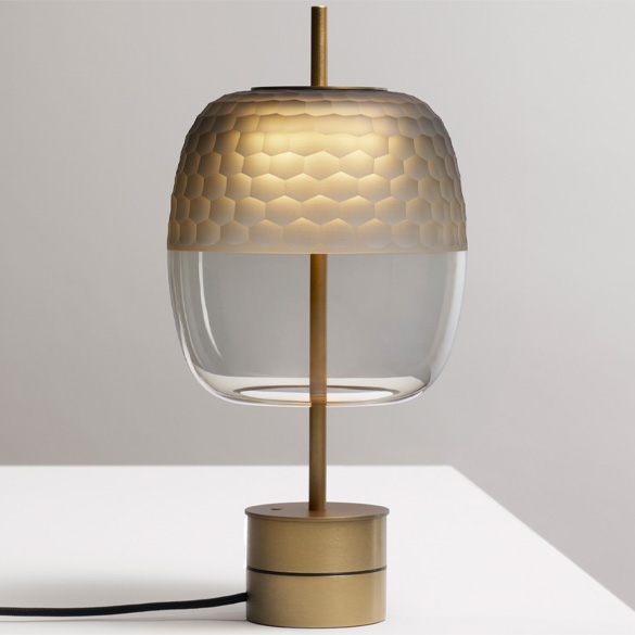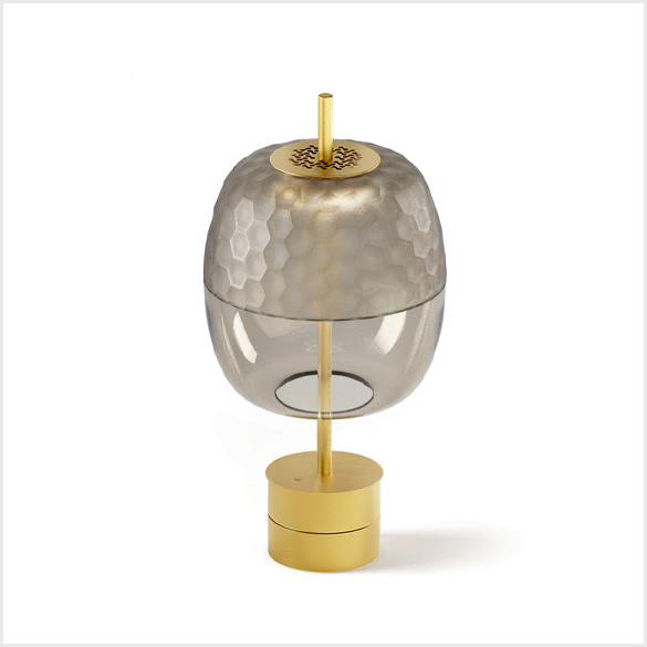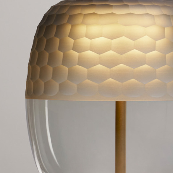 Adamas celebruje sztukę szkła, rzemiosło, dbałość i dbałość o jakość. Rezultatem jest ikoniczny i otulający kształt, który charakteryzuje otoczenie światłem, poprzez miękkie odcienie dmuchanego szkła i zmieniające się odbicia ręcznie wykonanej geometrycznej tekstury. Dyfuzor, dostępny w kolorze brązowym, dymionym, leśnej zieleni i różowym, kryje w sobie źródło światła LED ze skierowaną w dół wiązką światła, generując sugestywną grę odbić. Wersje wiszące, stołowe i podłogowe łączą kolory szkła z metalowymi strukturami w wykończeniu satynowo czarnym i satynowo mosiężnym.