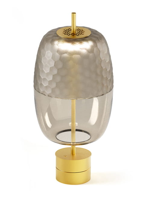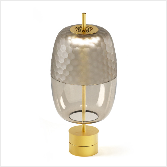Adamas celebruje sztukę szkła, rzemiosło, dbałość i dbałość o jakość. Rezultatem jest ikoniczny i otulający kształt, który charakteryzuje otoczenie światłem, poprzez miękkie odcienie dmuchanego szkła i zmieniające się odbicia ręcznie wykonanej geometrycznej tekstury. Dyfuzor, dostępny w kolorze brązowym, dymionym, leśnej zieleni i różowym, kryje w sobie źródło światła LED ze skierowaną w dół wiązką światła, generując sugestywną grę odbić. Wersje wiszące, stołowe i podłogowe łączą kolory szkła z metalowymi strukturami w wykończeniu satynowo czarnym i satynowo mosiężnym.