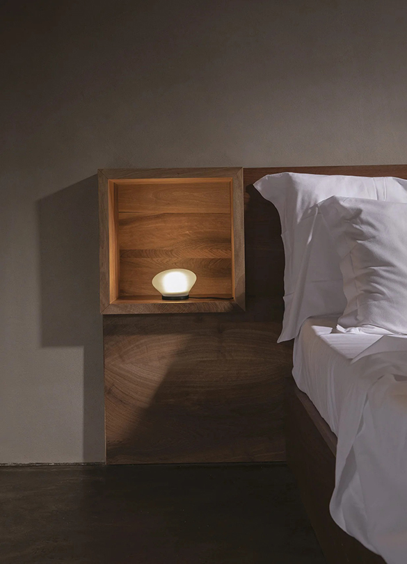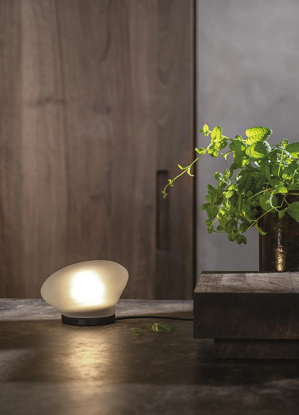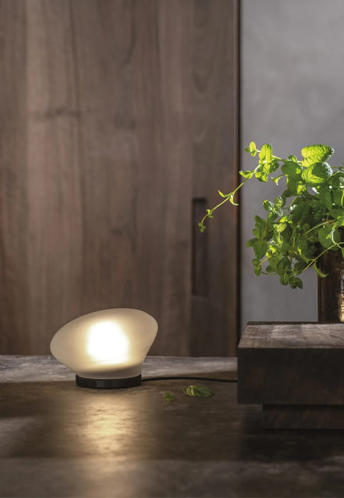 Okrągły, dmuchany reflektor z grubego szkła, w wykończeniu przezroczystym lub satynowym. Agua może być używana jako lampa stołowa lub ścienna, tworząc efekt halo na ścianie lub innej odbijającej światło powierzchni. Podstawa wykonana jest z czarnego anodowanego aluminium z wewnętrznym dyfuzorem chroniącym źródło światła LED. Można ją ustawić w geometrycznych lub losowych wzorach, jako punktowe oświetlenie na stoliku nocnym lub w ukrytym kącie domu lub ogrodu.