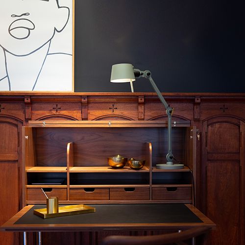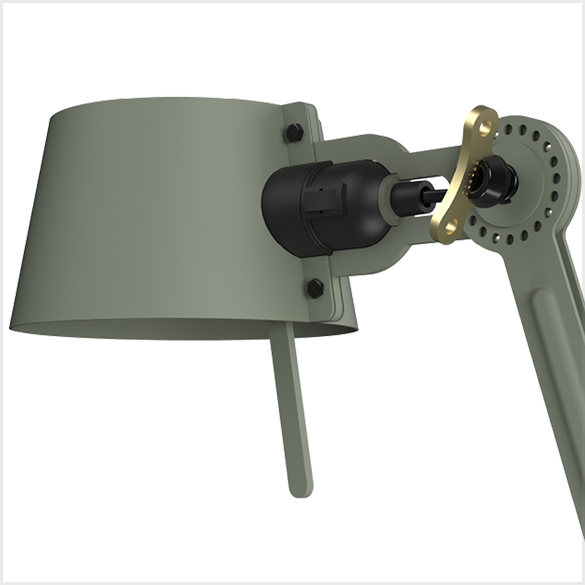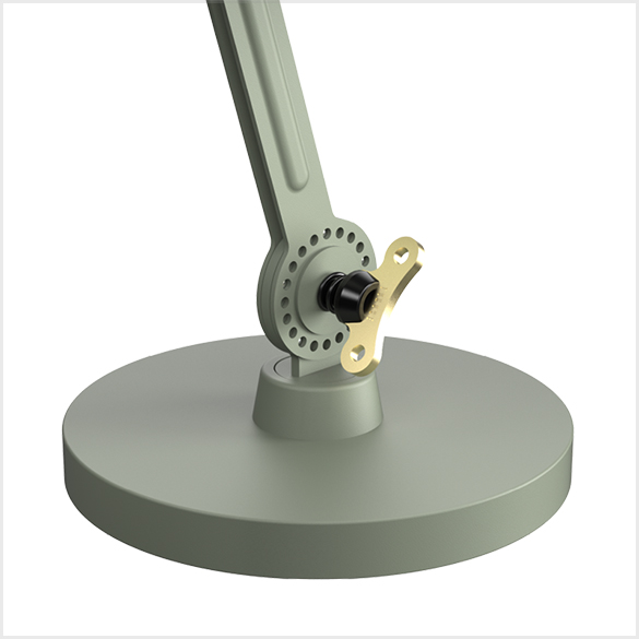 Dwuramienna podstawa biurka Tonone Bolt Desk Small to projekt Antona de Groofa. Solidna, industrialna seria lamp BOLT wyróżnia się funkcjonalnością kształtu, czystymi liniami i kultowym, dominującym elementem w postaci nakrętki motylkowej. Seria Bolt dostępna jest w 29 modelach. Lampa biurkowa charakteryzuje się dwoma regulowanymi, malowanymi proszkowo, stalowymi ramionami oraz otwartym kloszem z malowanego proszkowo aluminium. Otwarty klosz zapewnia odpowiednie rozproszenie światła. W zestawie znajduje się solidna, mosiężna nakrętka motylkowa, umożliwiająca regulację zawiasów. Nakrętka motylkowa nie tylko pełni funkcję funkcjonalną, ale jest również integralną częścią designu lampy i stanowi jej charakterystyczny element wizualny. Lampa jest obrotowa i posiada podstawę. Lampa biurkowa dostępna jest również z zaciskiem.