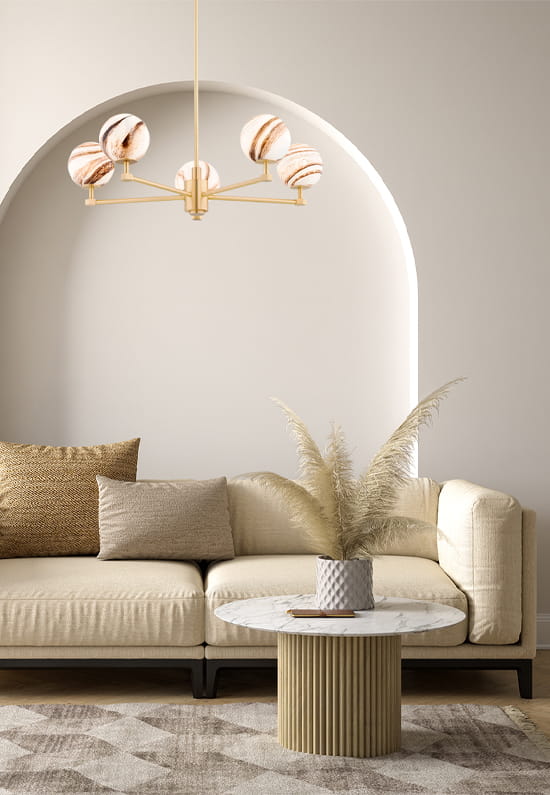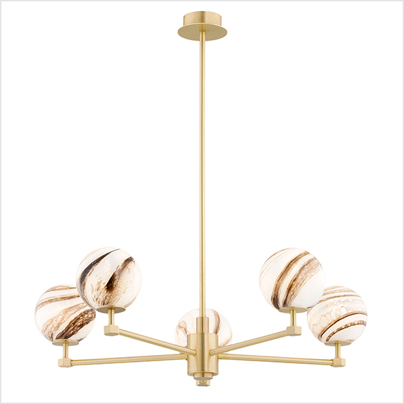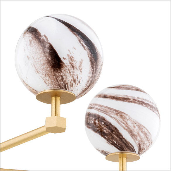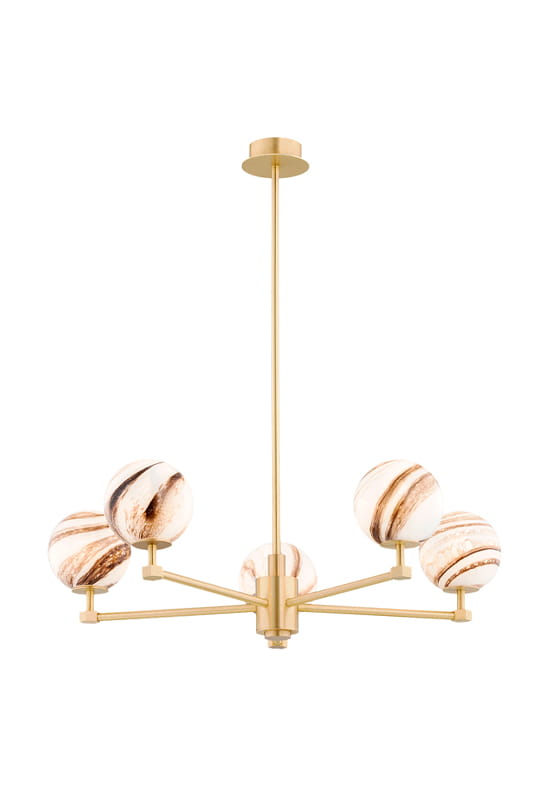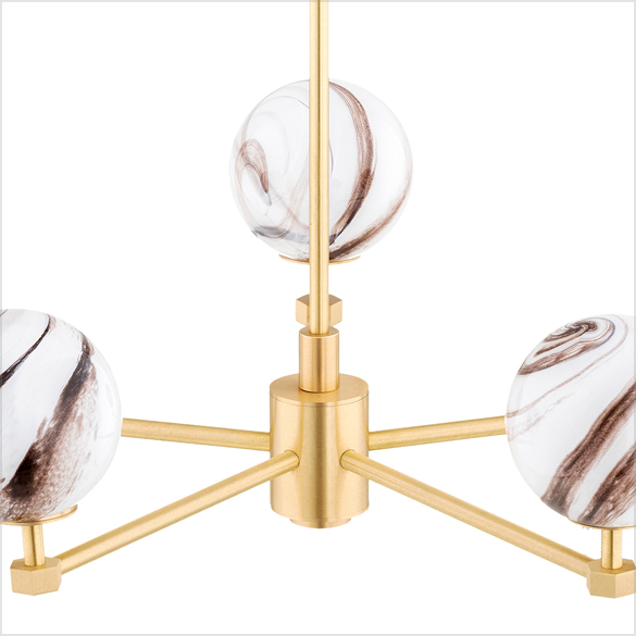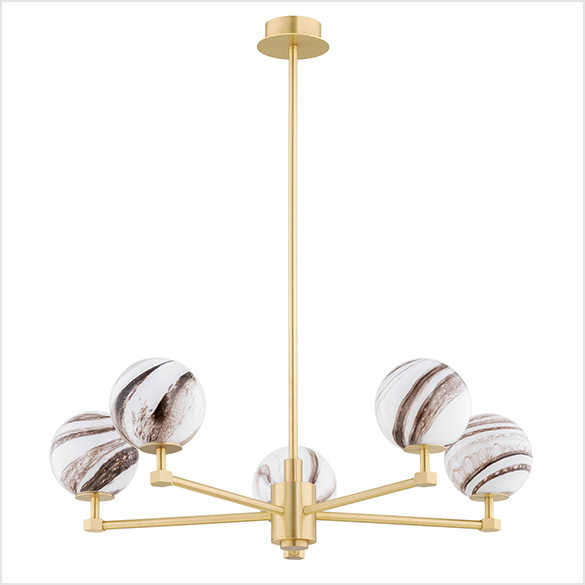- Szlachetne materiały podkreślają jego luksusowy charakter: stelaż ze szczotkowanego mosiądzu lśni ciepłym blaskiem, a klosze z polskiego szkła o wzorze marmuru dodają mu lekkości i finezji