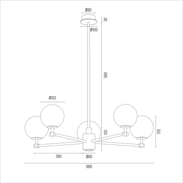 - Pięć szklanych kul skrywają miejsce na żarówki E14, tworząc harmonijną kompozycję o szerokości 68 cm