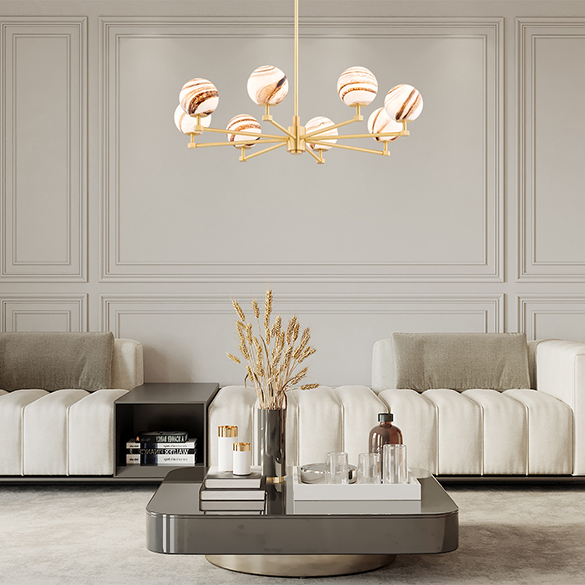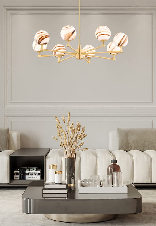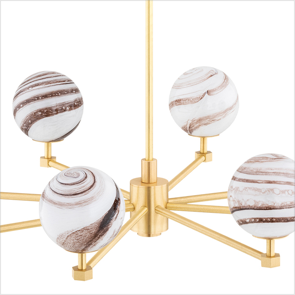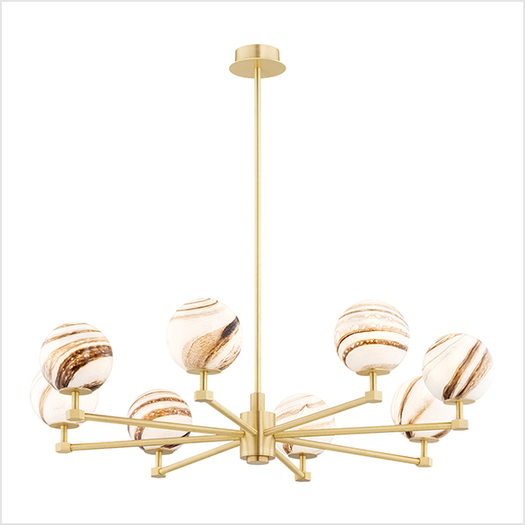 - Szlachetne materiały podkreślają jego luksusowy charakter: stelaż ze szczotkowanego mosiądzu lśni ciepłym blaskiem, a klosze z polskiego szkła o wzorze marmuru dodają mu lekkości i finezji