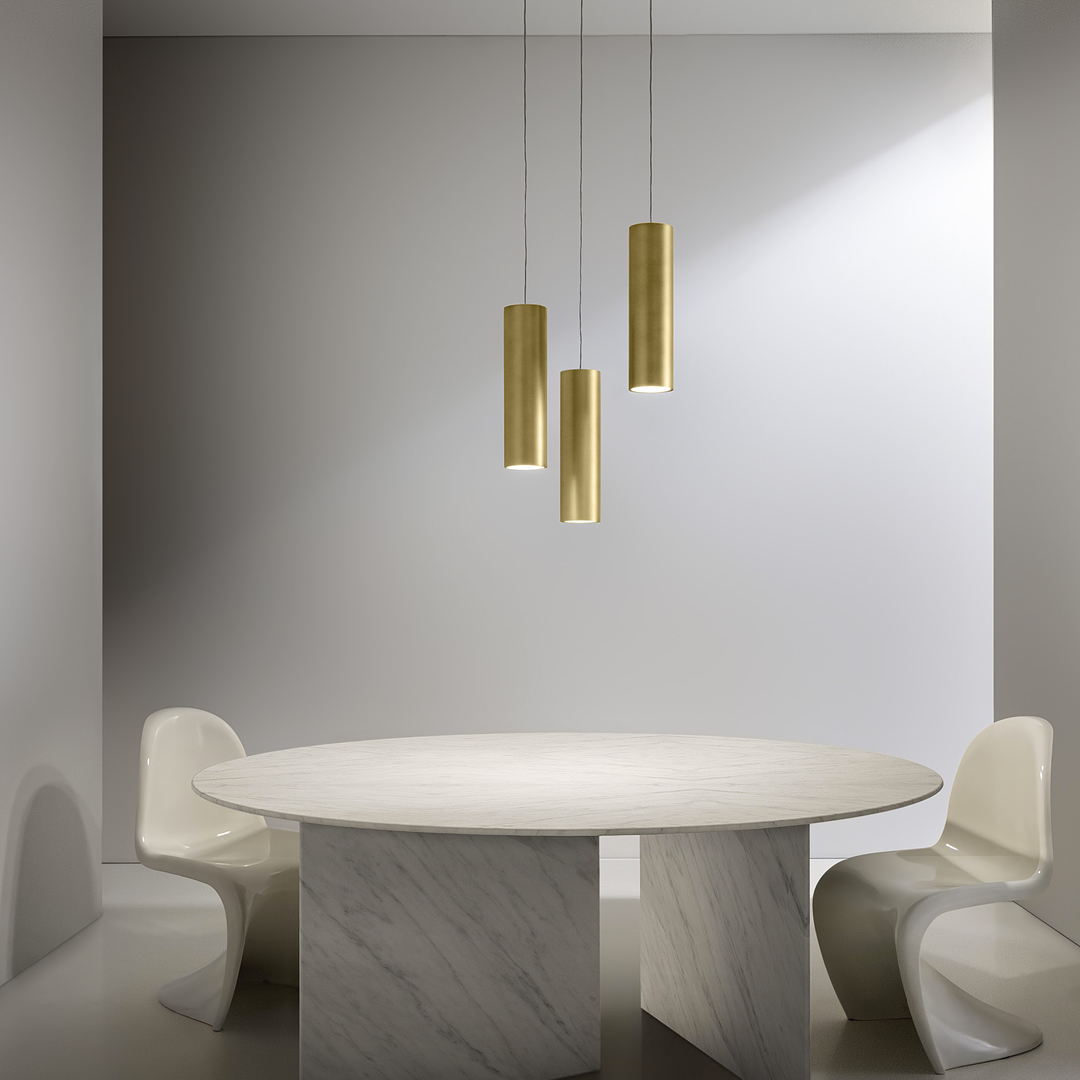 Lampa wisząca, stołowa, ścienna / sufitowa (dostępna również jako wpuszczana) i podłogowa z toczonego aluminium z zapłonem ON-OFF i przezroczystym kablem. Ścianę/sufit Tubino można z łatwością zamontować na wezgłowiu łóżka, zarówno w projektach mieszkaniowych, jak i hotelowych. W wersji podłogowej źródła światła są podwójne, a ich umiejscowienie na konstrukcji trzonka pozwala na wykorzystanie ich również jako lampki do czytania. Wersja stołowa jest również dostępna jako Tubino plus ze sterowaniem Step DIM i 5 ustawieniami natężenia światła. Wykończenia w kolorze szampańskiego brązu i tytanu, kabel w kolorze tkaniny między głowicą a konstrukcją.