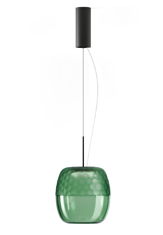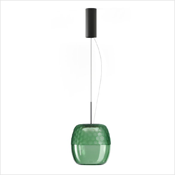 Adamas celebruje sztukę szkła, rzemiosło, dbałość i dbałość o jakość. Rezultatem jest ikoniczny i otulający kształt, który charakteryzuje otoczenie światłem, poprzez miękkie odcienie dmuchanego szkła i zmieniające się odbicia ręcznie wykonanej geometrycznej tekstury. Dyfuzor, dostępny w kolorze brązowym, dymionym, leśnej zieleni i różowym, kryje w sobie źródło światła LED ze skierowaną w dół wiązką światła, generując sugestywną grę odbić. Wersje wiszące, stołowe i podłogowe łączą kolory szkła z metalowymi strukturami w wykończeniu satynowo czarnym i satynowo mosiężnym.