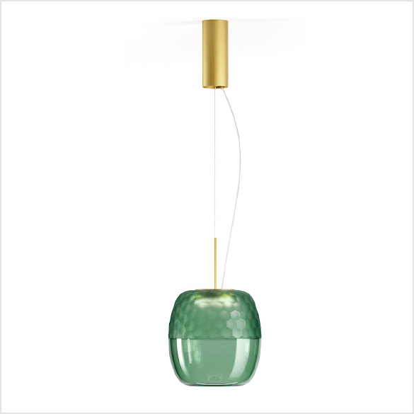 Adamas celebruje sztukę szkła, rzemiosło, dbałość i dbałość o jakość. Rezultatem jest ikoniczny i otulający kształt, który charakteryzuje otoczenie światłem, poprzez miękkie odcienie dmuchanego szkła i zmieniające się odbicia ręcznie wykonanej geometrycznej tekstury. Dyfuzor, dostępny w kolorze brązowym, dymionym, leśnej zieleni i różowym, kryje w sobie źródło światła LED ze skierowaną w dół wiązką światła, generując sugestywną grę odbić. Wersje wiszące, stołowe i podłogowe łączą kolory szkła z metalowymi strukturami w wykończeniu satynowo czarnym i satynowo mosiężnym.