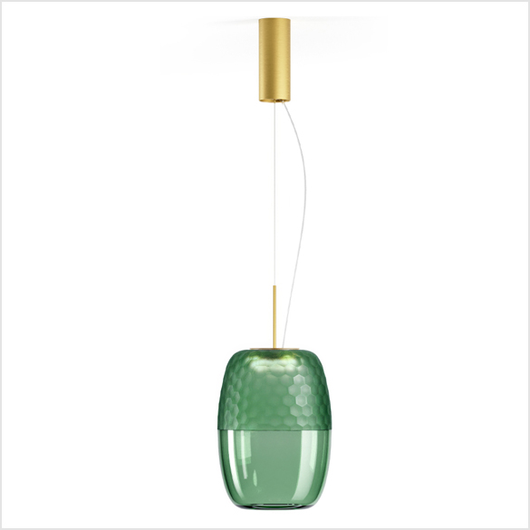 Adamas celebruje sztukę szkła, rzemiosło, dbałość i dbałość o jakość. Rezultatem jest ikoniczny i otulający kształt, który charakteryzuje otoczenie światłem, poprzez miękkie odcienie dmuchanego szkła i zmieniające się odbicia ręcznie wykonanej geometrycznej tekstury. Dyfuzor, dostępny w kolorze brązowym, dymionym, leśnej zieleni i różowym, kryje w sobie źródło światła LED ze skierowaną w dół wiązką światła, generując sugestywną grę odbić. Wersje wiszące, stołowe i podłogowe łączą kolory szkła z metalowymi strukturami w wykończeniu satynowo czarnym i satynowo mosiężnym.
