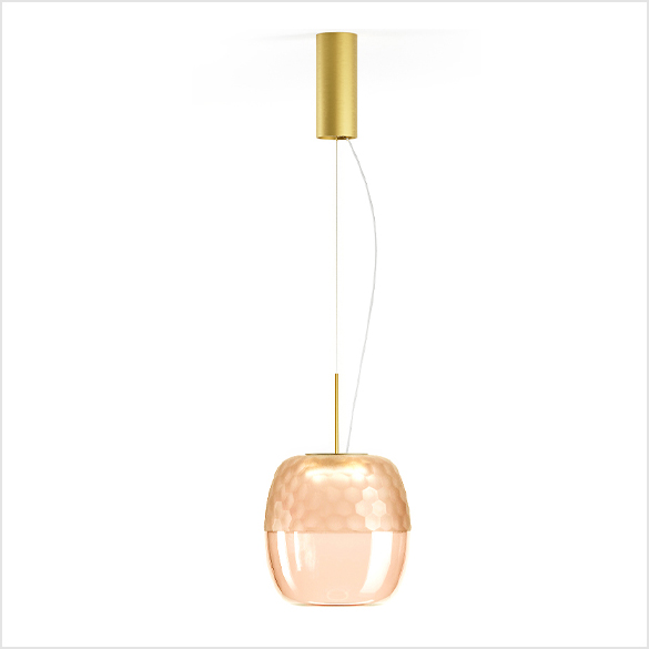 Adamas celebruje sztukę szkła, rzemiosło, dbałość i dbałość o jakość. Rezultatem jest ikoniczny i otulający kształt, który charakteryzuje otoczenie światłem, poprzez miękkie odcienie dmuchanego szkła i zmieniające się odbicia ręcznie wykonanej geometrycznej tekstury. Dyfuzor, dostępny w kolorze brązowym, dymionym, leśnej zieleni i różowym, kryje w sobie źródło światła LED ze skierowaną w dół wiązką światła, generując sugestywną grę odbić. Wersje wiszące, stołowe i podłogowe łączą kolory szkła z metalowymi strukturami w wykończeniu satynowo czarnym i satynowo mosiężnym.