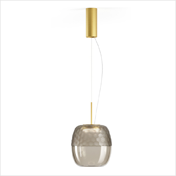 Adamas celebruje sztukę szkła, rzemiosło, dbałość i dbałość o jakość. Rezultatem jest ikoniczny i otulający kształt, który charakteryzuje otoczenie światłem, poprzez miękkie odcienie dmuchanego szkła i zmieniające się odbicia ręcznie wykonanej geometrycznej tekstury. Dyfuzor, dostępny w kolorze brązowym, dymionym, leśnej zieleni i różowym, kryje w sobie źródło światła LED ze skierowaną w dół wiązką światła, generując sugestywną grę odbić. Wersje wiszące, stołowe i podłogowe łączą kolory szkła z metalowymi strukturami w wykończeniu satynowo czarnym i satynowo mosiężnym.
