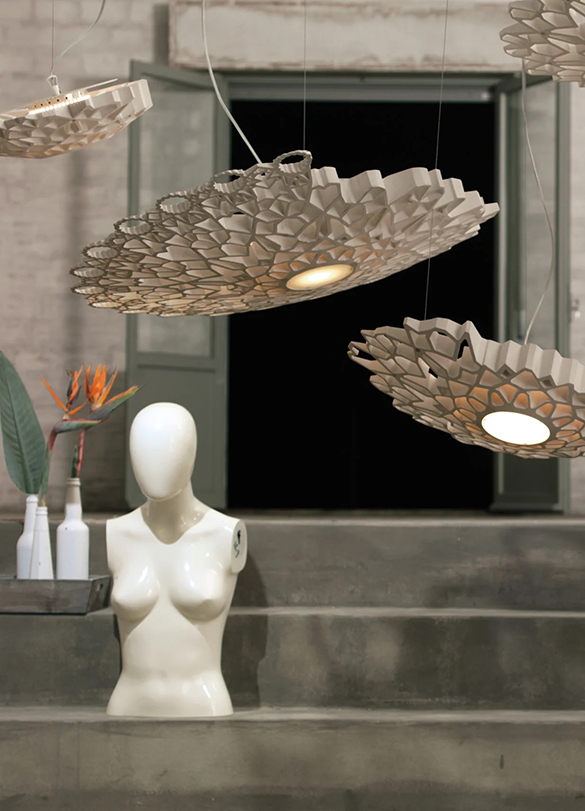 Notredame filtruje światło niczym to odbijające się od pięknych rozet witraży gotyckiej katedry. Rozeta tej niezwykle dekoracyjnej lampy wiszącej lub ściennej wykonana jest ze złotego lub białego technopolimeru. Technopolimer można pomalować, aby idealnie wpasował się w ścianę, na której zamontowana jest lampa, tworząc trójwymiarowy efekt. Źródło światła LED emituje światło bezpośrednio z centralnego rdzenia i pośrednio z teksturowanego podświetlenia dyfuzora. Lampa jest dostępna w dwóch rozmiarach i może być ścienna, sufitowa lub wisząca.