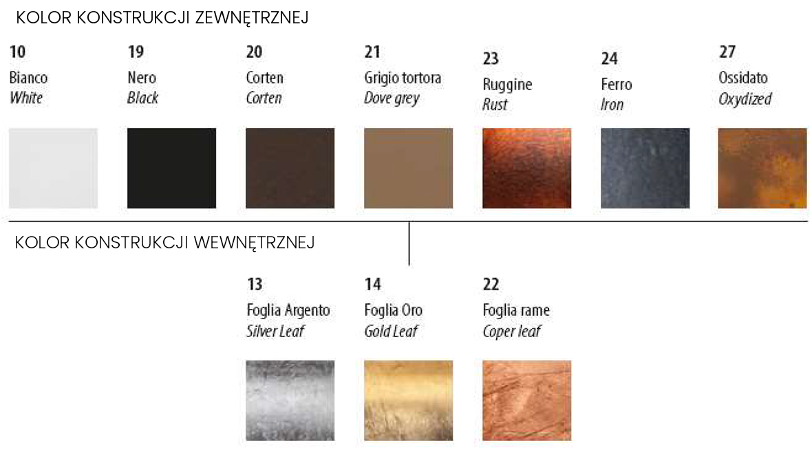 | Dostępne kolory : | Kolor konstrukcji zewnętrznej - White 10, Black 19, Dove grey 21, Rust 23, Iron 24, Gold 28, Oxydized 27 - Kolor konstrukcji wewnętrznej - Silver leaf 13, Gold leaf 14, Copper leaf 22 |