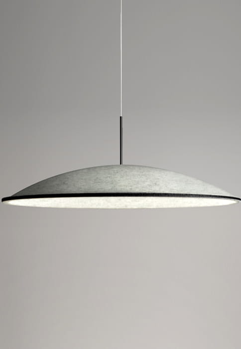 - Absorbujący dźwięk abażur firmy Slalom składający się w 75% z tworzywa sztucznego pochodzącego z recyklingu pokrytego w 96% filcu z recyklingu.
