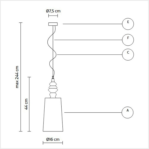 - Wykonanie - Lampa - błyszcząca biała ceramika ( A ), podstawa sufitowa - błyszczący biały metal ( E ), kabel wiszący - stalowy 2 m ( F ), kabel elektryczny - przezroczysty 2 m ( C )