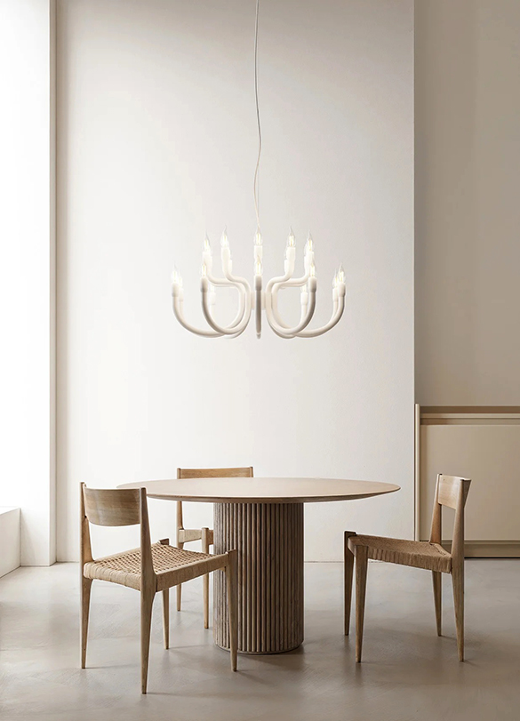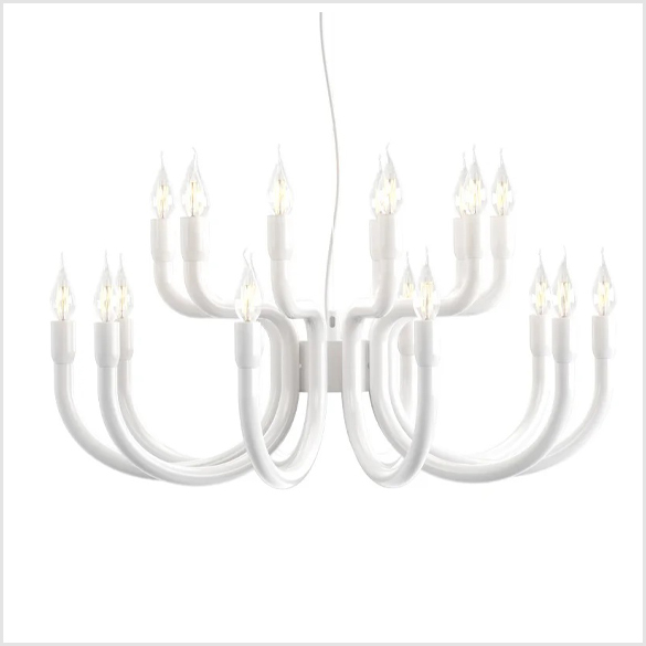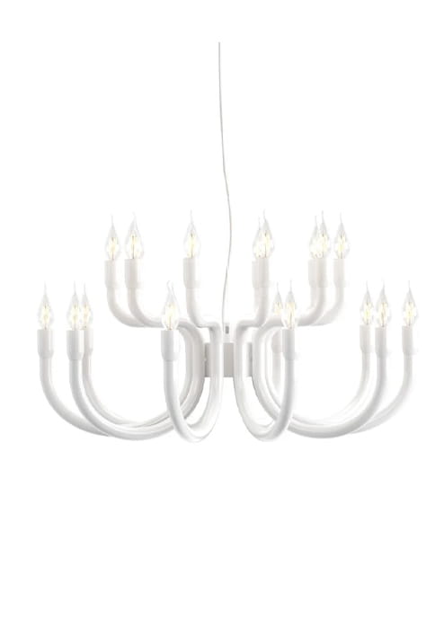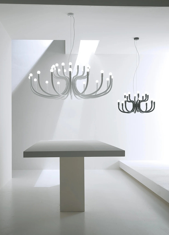 Klasyczny design antycznych świeczników w minimalistycznym i niezwykle współczesnym wydaniu prezentuje żyrandol z dziesięcioma lub szesnastoma lakierowanymi aluminiowymi ramionami. Barokowe woluty przywodzą na myśl ponadczasową elegancję, dostępny w kolorze białym lub czarnym.