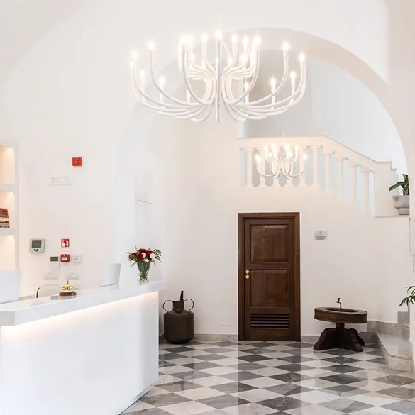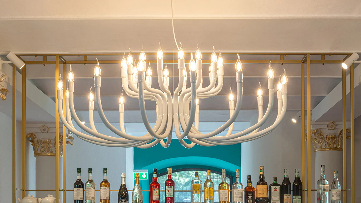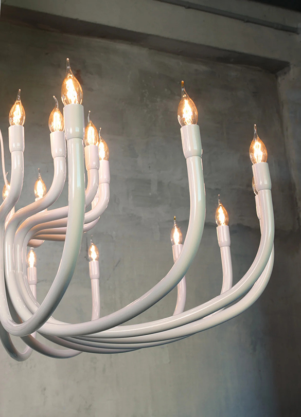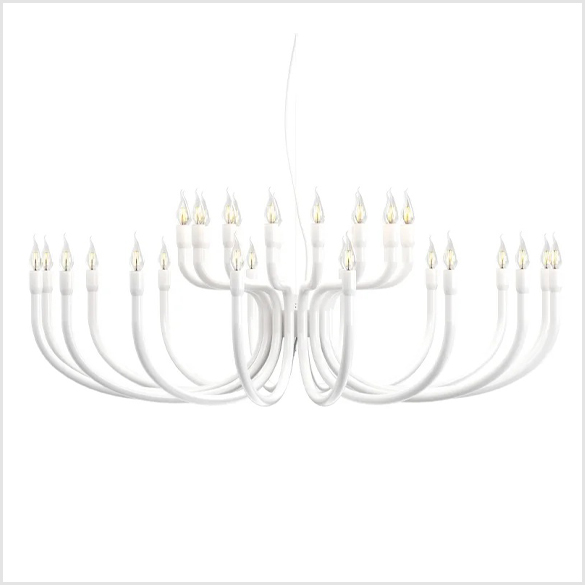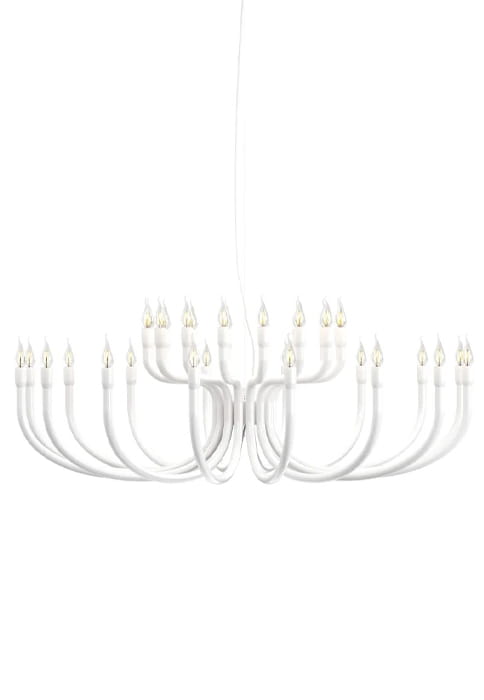 Klasyczny design antycznych świeczników w minimalistycznym i niezwykle współczesnym wydaniu prezentuje żyrandol z dziesięcioma lub szesnastoma lakierowanymi aluminiowymi ramionami. Barokowe woluty przywodzą na myśl ponadczasową elegancję, dostępny w kolorze białym lub czarnym.