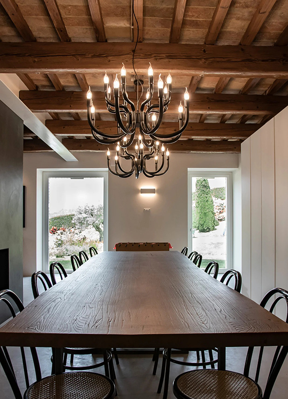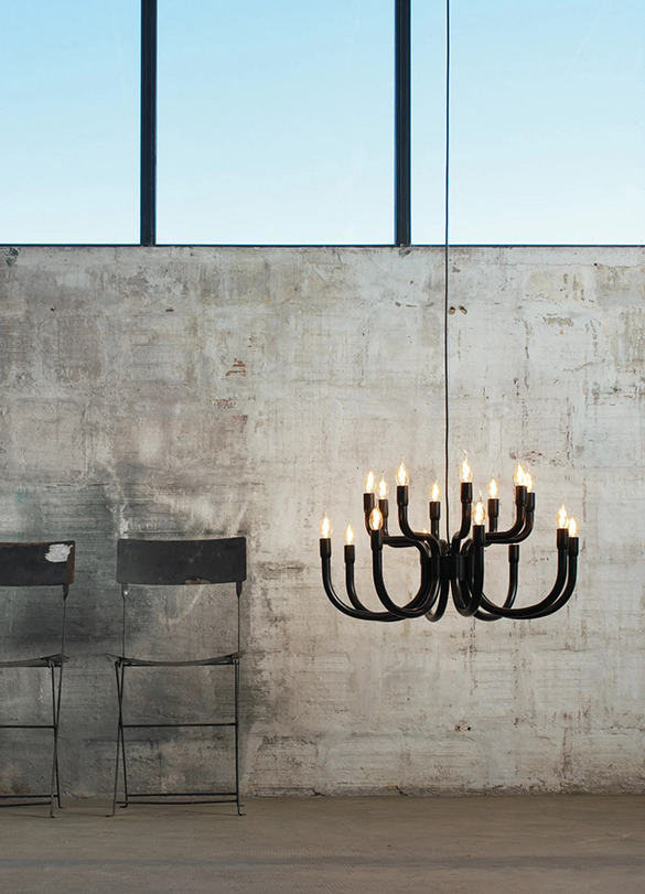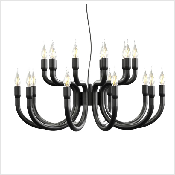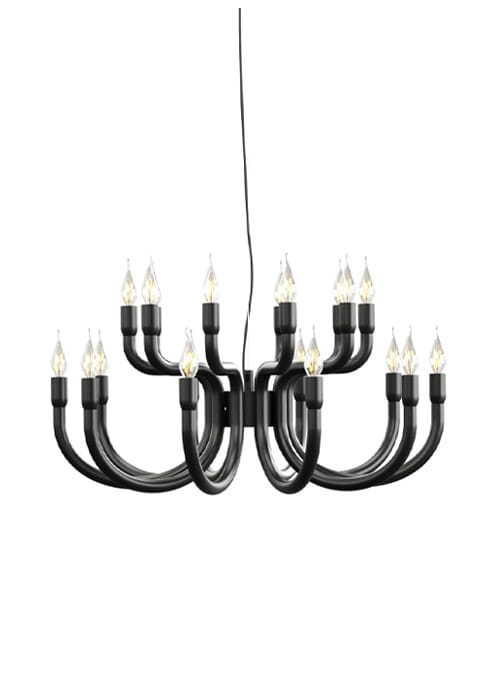 Klasyczny design antycznych świeczników w minimalistycznym i niezwykle współczesnym wydaniu prezentuje żyrandol z dziesięcioma lub szesnastoma lakierowanymi aluminiowymi ramionami. Barokowe woluty przywodzą na myśl ponadczasową elegancję, dostępny w kolorze białym lub czarnym.