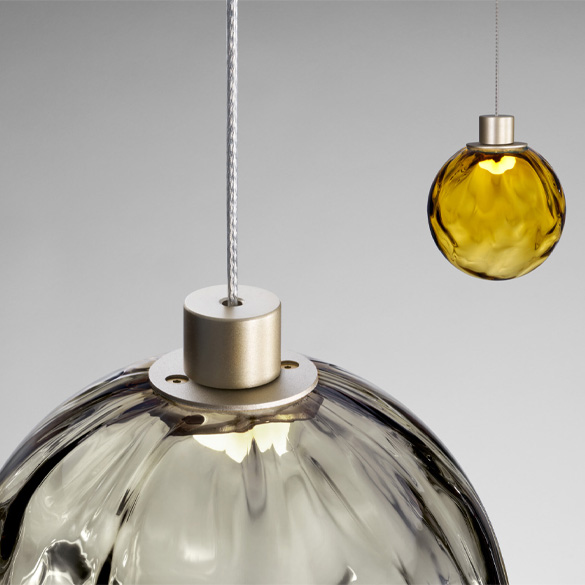 Tradycja ręcznego rzemiosła z dmuchanego szkła rodzi Murané, serię opraw do montażu jako pojedyncze zawieszenia lub niestandardowe zestawy, na powierzchni lub jako częściowo zagłębione oprawy do montażu na ścianie i suficie. Kulisty dyfuzor z przezroczystego szkła z brązu jest ręcznie wykonany z falistym efektem o wspaniałym efekcie dekoracyjnym. Źródło LED jest minimalne i ukryte w poliwęglanowej osłonie, która zapewnia optymalne rozproszenie światła. Wersje podwieszane są dostępne z daszkiem indywidualnym lub bez, w celu połączenia z daszkami wpuszczanymi lub klastrowymi.