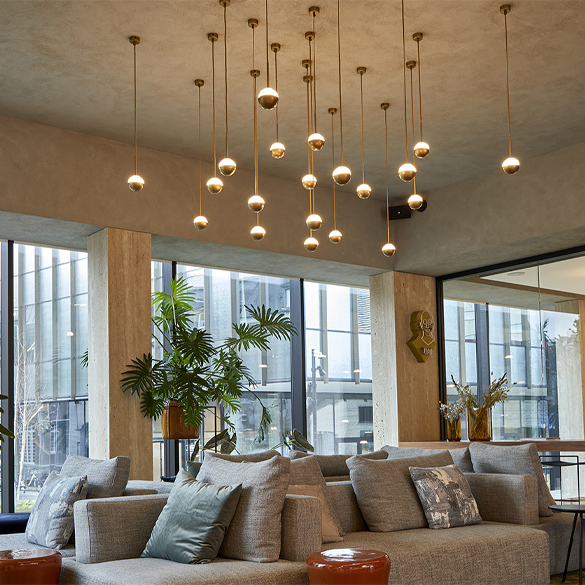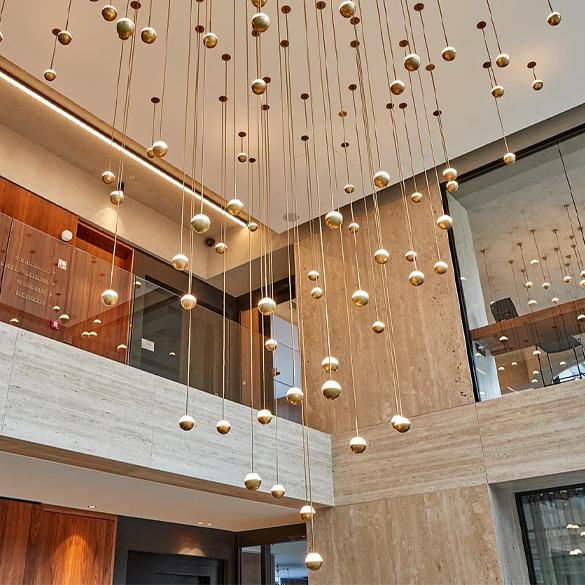 Pośrednia, ściemnialna rzeźba świetlna LED zawieszona nad głową, tworzy magiczny efekt. Lampy wiszące Alfi prezentują swoją wszechstronność jako galaktyka kul lub pojedyncza lampa planetarna.