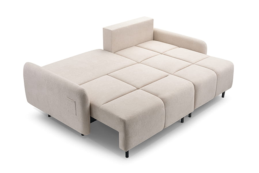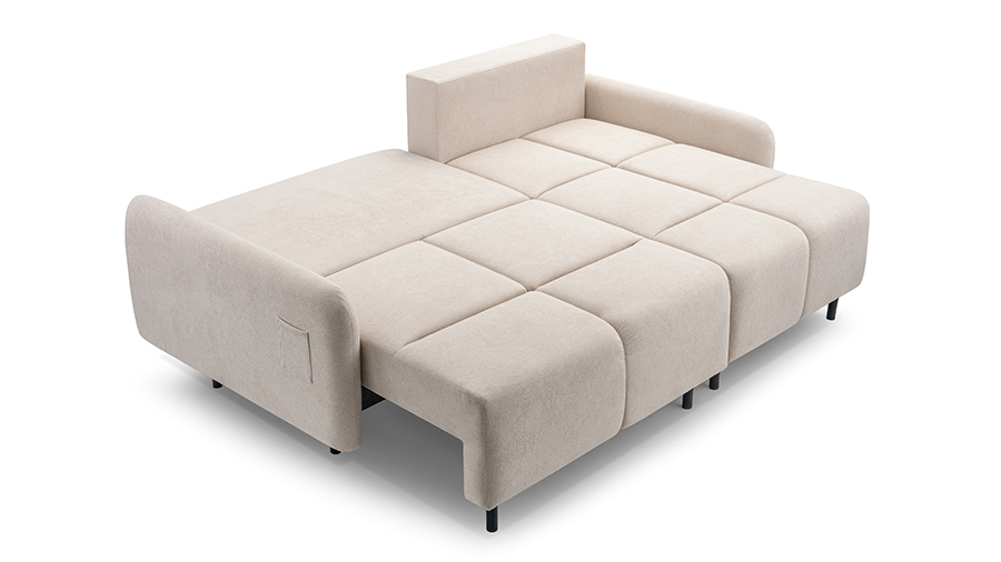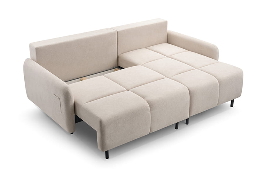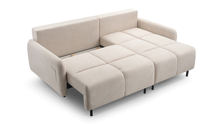 - narożnik z funkcją spania i pojemnika na pościel ( System DL to jeden z najprostszych systemów rozkładania, który stosowany jest zarówno w narożnikach, jak i w sofach. Rozłożenie mebla z tym systemem rozpoczynamy od wysunięcia siedziska. Następnie wystarczy położyć oparcie i mebel jest gotowy do spania. System DL nie wymaga odsuwania mebla od ściany, a w modelach z tym rodzajem rozkładania najczęściej znajduje się pojemnik na pościel )
