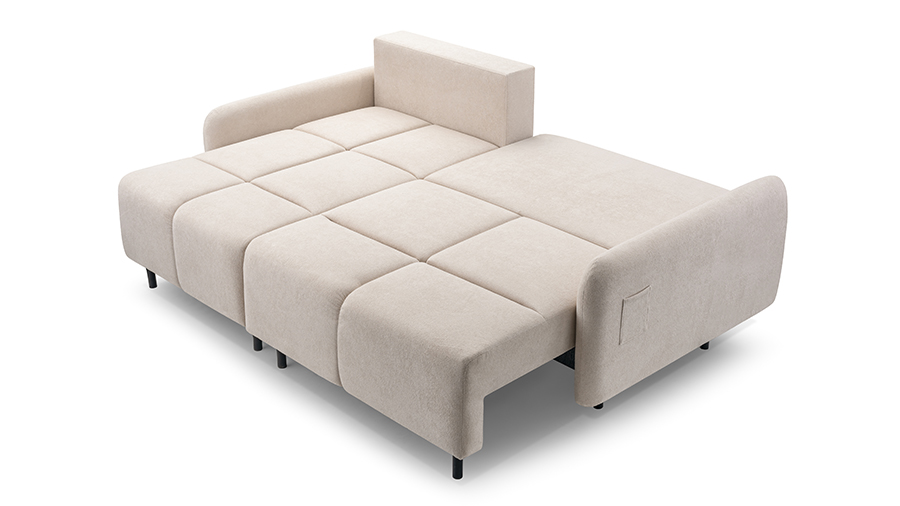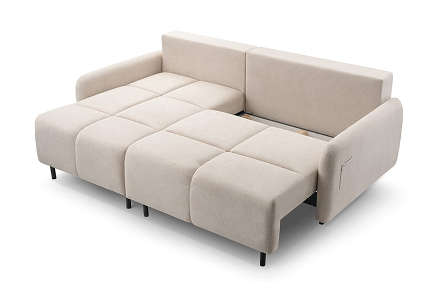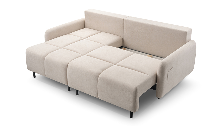 - narożnik z funkcją spania i pojemnika na pościel ( System DL to jeden z najprostszych systemów rozkładania, który stosowany jest zarówno w narożnikach, jak i w sofach. Rozłożenie mebla z tym systemem rozpoczynamy od wysunięcia siedziska. Następnie wystarczy położyć oparcie i mebel jest gotowy do spania. System DL nie wymaga odsuwania mebla od ściany, a w modelach z tym rodzajem rozkładania najczęściej znajduje się pojemnik na pościel )