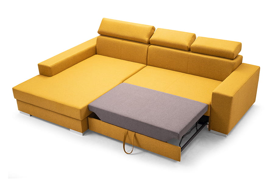 - narożnik z funkcją spania i pojemnikiem ( system “delfin” to jeden z najbardziej popularnych mechanizmów rozkładania, który najczęściej stosowany jest w narożnikach. Rozłożenie mebla z zastosowanym systemem “delfin” polega na wyciągnięciu spod siedziska wbudowanej szuflady, a następnie wysunięciu znajdującej się w niej powierzchni do spania przy pomocy specjalnego uchwytu. Siedzisko oraz wysunięta część równają się na jednym poziomie tworząc powierzchnię do spania )